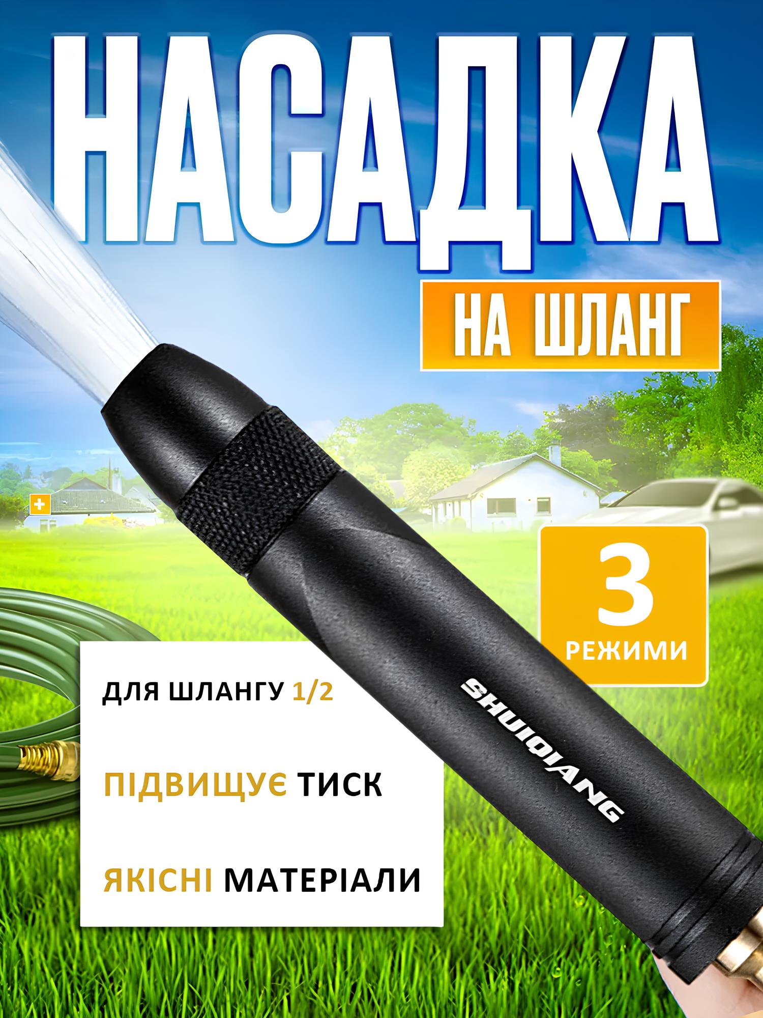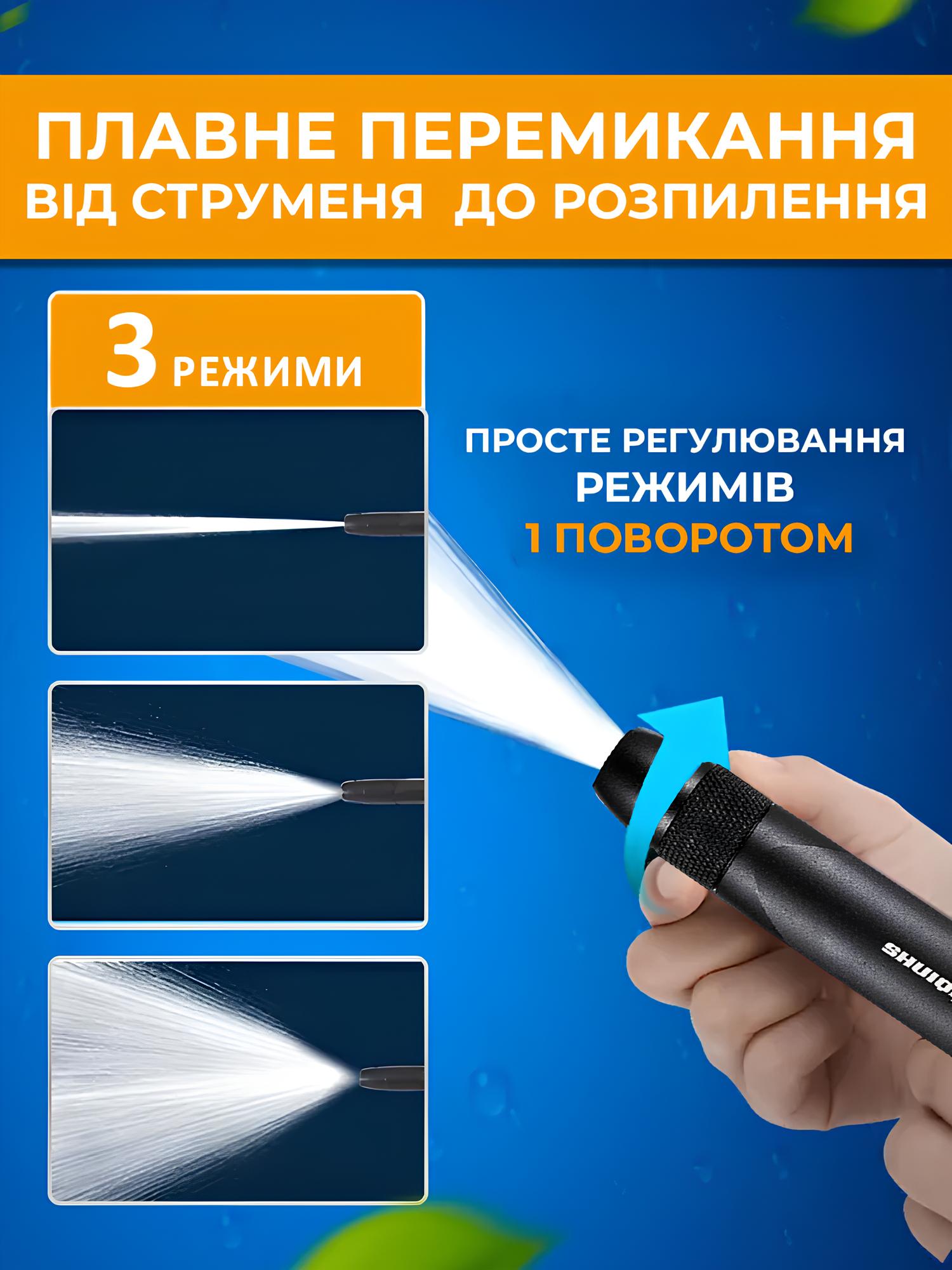 Забезпечує три режими поливу: жорсткий струмінь, розпил типу (туман), конусне розпилення.